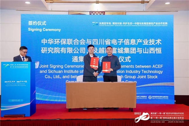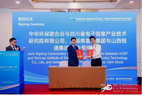 论坛现场隆重举行战略合作签约仪式,中华环保联合会与四川省电子信息产业技术研究院、越南富城集团与山西恒通集团分别签署合作协议,双方将围绕生态环保技术研发、绿色产业项目落地、中越跨境生态合作等核心领域深化协同,为后续务实合作落地筑牢坚实基础,助力区域绿色产业高质量发展。