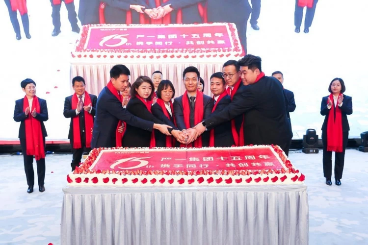 表彰环节结束后,集团迎来了十五周年庆典的重要时刻。现场灯光璀璨,暖意融融,十五周年主题微电影缓缓播放,镜头里的每一个故事、每一个片段,都诉说着严一十五年的成长与辉煌。严一集团董事长贾旭刚携集团高层领导班子成员一同上台,共同切开象征“十五载奋斗与硕果”的纪念蛋糕,并举杯向全体员工致以诚挚的新年祝福。