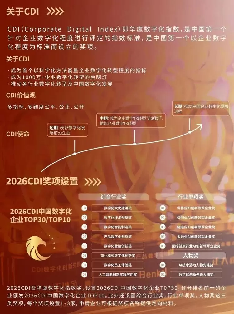 国内首个CDI奖项评选同步开展,以专业权威评价体系,挖掘数字化创新标杆,树立行业典范。多维度布局彰显2026CDIE在资源整合、生态构建、行业引领的强大实力,为企业提供品牌展示、业务拓展、合作共赢的优质机遇 。