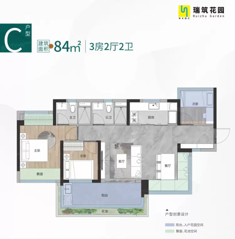 84㎡三房两厅两卫:采用单边独立设计,四开间均朝南,南北通透,采光通风俱佳。餐客厨一体化,6米舒适互动厅配合酒店式主卧套房,生活氛围宜人。