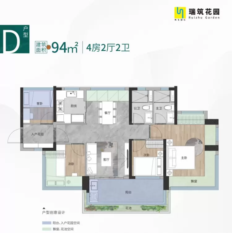 94㎡四房两厅两卫:属于改良型大户,拥有高拓展入户花园,四开间南北对流,客餐厨一体化设计,主卧为套房结构辅以270°飘窗,带来极致观江景致,满足多子女家庭或三代同堂的生活需求。