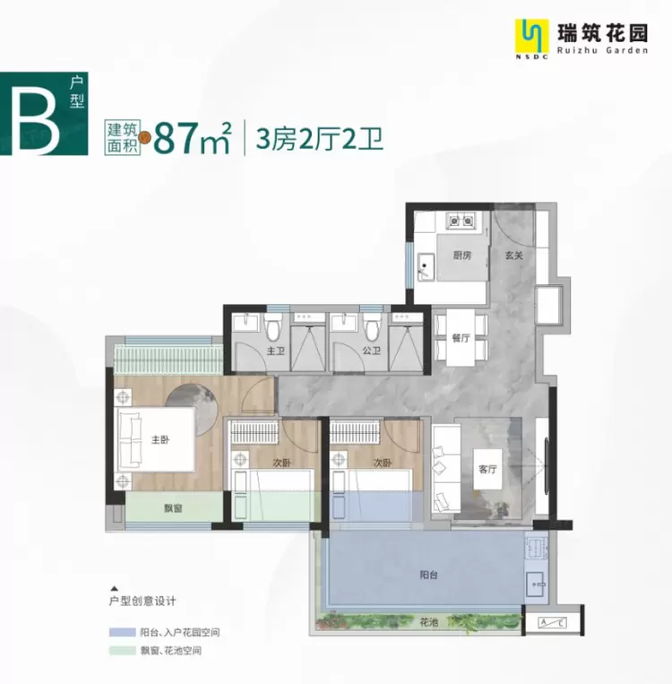 87㎡三房两卫:宽绰玄关与双厅一体设计,提供约6米阔绰尺度。南向四开间,约5.8米宽景阳台,无论起居还是宴客都能享受宽阔视野与自然通风;主卧配备独立套房,私密性与舒适度兼备,实用功能与生活美学两不误。