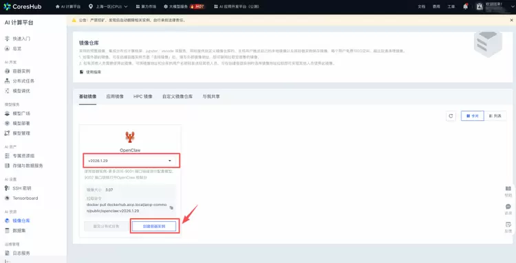 登录基石智算,进入「镜像仓库」,选择「OpenClaw」,点击「创建容器实例」,按照页面提示完成基础配置。