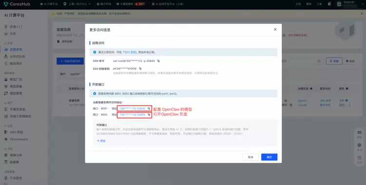在“容器实例-更多访问”中,上方配置OpenClaw页面得到安全访问密钥token (Gateway Token),使用端口 9002 对应地址,添加该「安全访问密钥」(?token=xxxxxx),例如 139.xxxxxx?token=xxxxxx,在新窗口打开即可。
