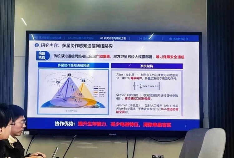 倪子涵汇报“星地上行场景下隐蔽信号的多维域弥散设计与智能接收技术”。针对星地上行链路信号易被侦察、干扰的问题,她提出时域、频域、空域多维域信号弥散设计方法,引入深度学习实现智能接收,在保障隐蔽性的同时对抗信道衰落与噪声,奠定工程应用理论基础。