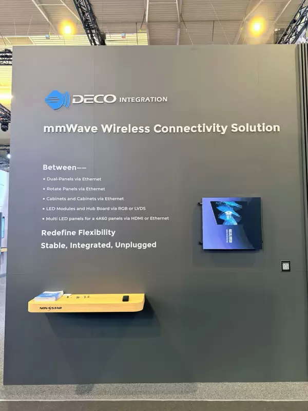 成立于2021年的德氪微已连续四年亮相 ISE。过去一年,德氪微围绕多形态LED显示产品的内部互连持续推进毫米波无线连接技术落地:在实现屏内无线数据传输与无线供电的基础上,将能力下沉至COB模组级,并兼容SPI、Ethernet、LVDS、HDMI、USB、RGB等主流接口与协议,提升系统适配性与部署灵活性;同时推出近距离毫米波无线以太网与无线HDMI整体方案(MDKT157xES、MDKT167xHL),以及支持旋转传输以太网协议的SDKT1020-FET模组,为多形态产品提供更可复制的集成路径。