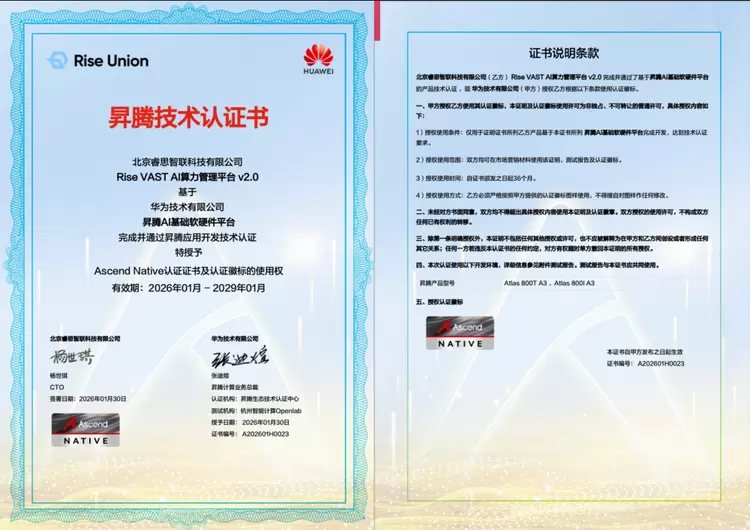 2026年1月30日,北京睿思智联科技有限公司正式宣布,旗下AI异构算力管理平台与华为最新一代昇腾Atlas 800T /800I A3训练服务器完成深度兼容性测试,并获得华为技术认证证书。