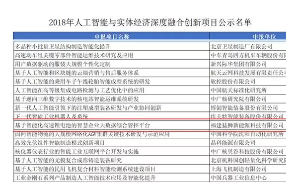 日前,由猛狮科技旗下福建猛狮新能源申报的“基于智能化高速锂电池的智慧企业大数据综合管控平台”项目,入选国家工信部“2018年人工智能与实体经济深度融合创新项目”名单,成为我国首批人工智能与实体经济深度融合创新项目中唯一的动力电池项目。