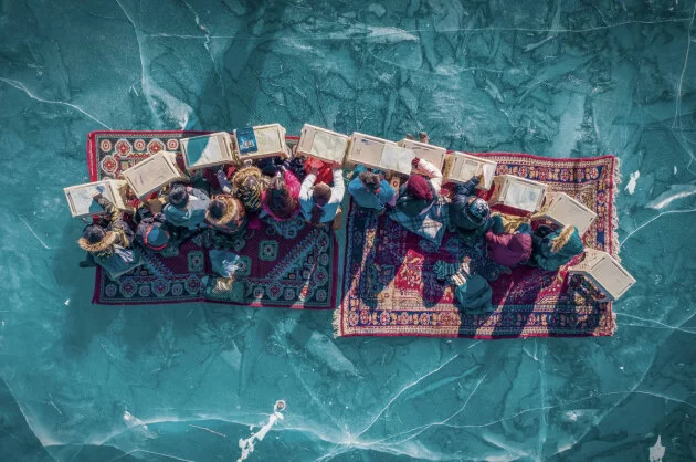 纪实摄影师İsmail Kaplan 拍摄的《恰尔德湖冰上课堂》,将镜头对准了严酷寒冬中坚守求学的孩子们。在结冰的恰尔德湖面上,学生们聚集诵读经文。“信仰、传统与坚韧,在此冰封之境交汇相融”,摄影师在作品描述中写道。本届大赛评委、前《中国国家地理》首席摄影师姜平认为:“冷暖的色彩对比下,孩子们坐在如一叶方舟的地毯上,给人以想象的空间。” 知名策展人、北京电影学院影像传媒学院教授朱炯评价道:“寒冷的蓝色冰湖上一方热烈的红色地毯,为读书的孩子们烘托出温暖的天地。独特的大自然教室,不可思议。”该作品已入选本届大赛周度“社交媒体评选奖”。