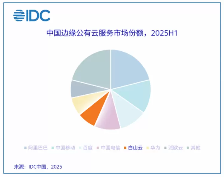 其中,白山云表现突出。2025上半年白山云市场份额进一步提升,跻身中国边缘公有云Top5,并稳居独立边缘云服务商首位。