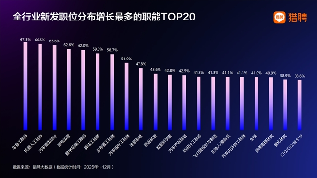 从2025年猎聘平台新发职位同比增长最快的职能TOP20来看,就业机会呈现出明显的技术导向。新能源汽车与智能制造成为最突出的增长风口,汽车研发、设计与制造全链条岗位集体上榜,反映出产业仍处于高速扩张与技术升级并行阶段;同时,算法工程师、数字后端、数据科学家、全栈等岗位持续高增长,显示具备工程化落地与系统集成能力的人才成为市场“硬通货”。此外,生物医药、游戏内容、金融科技等领域保持活跃,高端技术管理岗位进入榜单,表明企业正同步强化技术能力与战略治理水平。