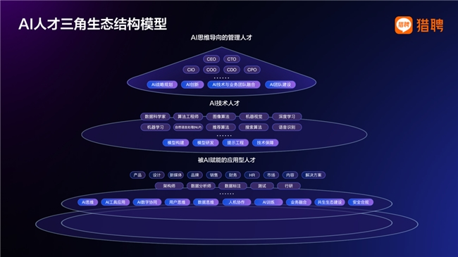 基于对数百万职位标签与人才画像的分析,猎聘大数据研究院构建了AI时代的人才“三角结构模型”的三层体系:依次由塔尖层——AI思维导向的管理人才、中坚层——AI技术人才、基础层——被AI系统性赋能的应用型人才构成。三类人才相互支撑、协同作用,共同决定AI对产业升级和就业结构的实际影响。