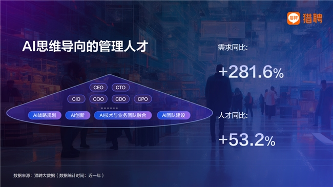 猎聘大数据显示,近一年具备AI思维导向的CXO级人才需求同比增长达281.6%,主要集中于计算机软件、电子/半导体/集成电路、互联网、人工智能、新能源等行业。此类人才主要负责将AI能力转化为企业战略、业务模式和组织流程。在供给侧,该类人才同比增长53.2%,其中CEO与CTO/CIO合计占比超过七成,表明AI转型已成为企业“一把手工程”。企业家和高管的AI认知能力、组织变革能力和战略判断能力,正在成为影响企业长期竞争力的重要生产要素,也对高层次复合型管理人才的培养提出了更高要求。