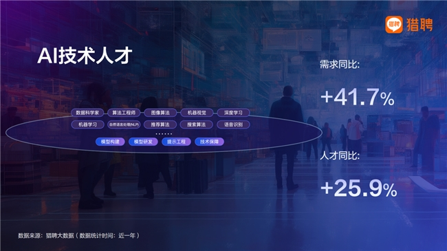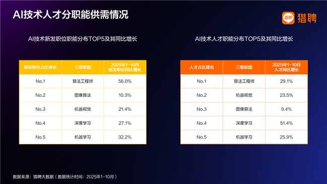 AI技术人才供需两端增长均超25%。分职能看,算法工程师、机器学习和深度学习岗位在供需两端均保持高速增长,共同构成AI技术落地的“黄金三角”。