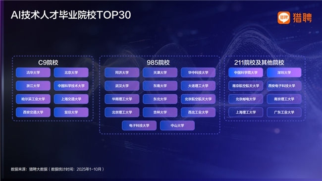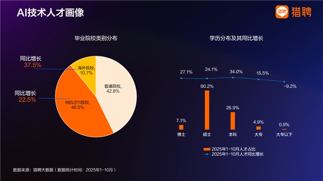 从人才结构看,AI技术人才呈现出明显的高知化与集中化特征,高学历、重点高校及海外背景人才占据较高比例。这一结构性特征表明,尽管AI技术岗位需求快速增长,但优质供给仍然相对有限,高端技术人才的培养和引进,仍是制约AI产业进一步扩张的重要因素。