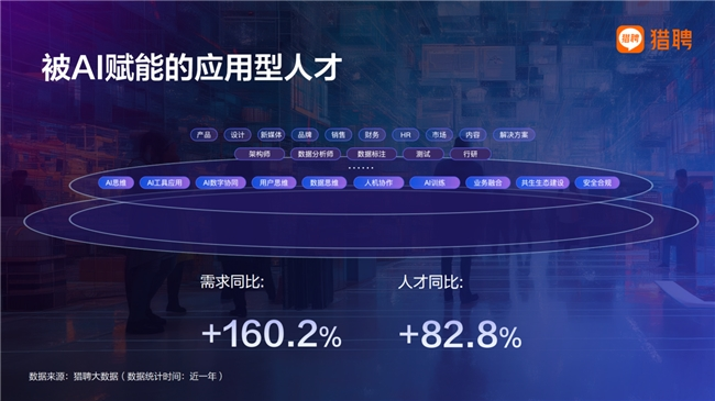 这一层人才近一年的需求同比增长超过160%,他们广泛分布于产品、设计、运营、市场、人力资源等职能。其价值不在于“会不会用AI”,而在于能否将AI深度嵌入业务流程,形成稳定、可复制的效率提升机制。大量实践表明,AI并未简单替代岗位,而是通过重塑岗位能力结构、降低技能门槛、提升单位人效,显著扩大了中高质量就业空间。
