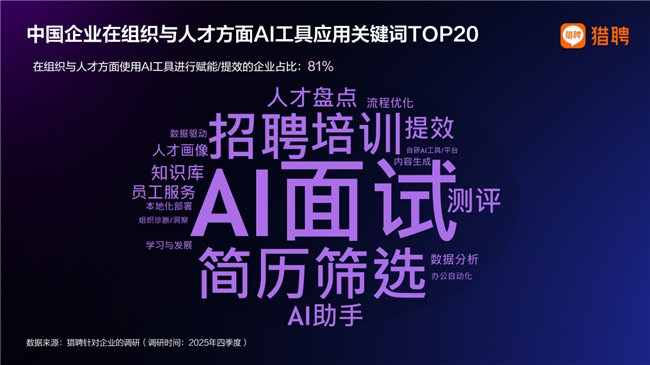 猎聘调研显示,66.3%的企业在2025年进一步加大研发投入,AI成为最主要投入方向;93.4%的企业已启动未来1-3年的人才前瞻布局,AI相关人才位居首位。AI正从“降本增效工具”升级为企业长期竞争力的基础设施。在具体落地层面,已有81%的企业在组织和人才方面使用AI赋能、提效,而AI面试、招聘、培训和人才盘点成为AI应用最集中的领域。