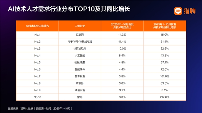 AI正加速向制造业、汽车、能源等实体经济渗透,家电、整车制造等行业的AI技术岗人才需求2025年1-10月同比增速均超过100%,标志着中国制造业正由自动化迈向智能化阶段。