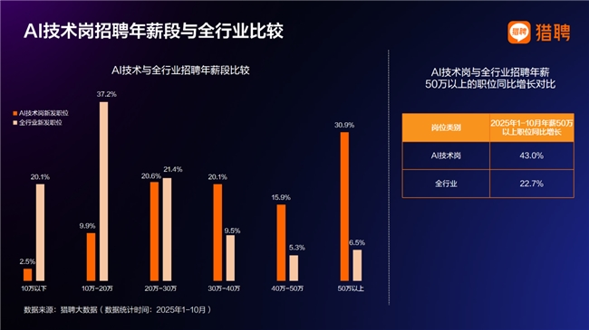 AI技术岗年薪50万元以上的占比为30.9%。企业愿意为具备AI应用能力的人才支付溢价,AI技能已成为获得高薪的重要竞争力。