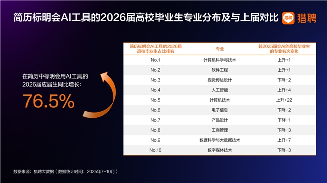 2026届高校毕业生正成为真正的“AI原生代”。猎聘大数据显示,该届毕业生中标注具备AI技能的人数同比增长76.5%,AI能力已从求职“加分项”转变为职场“出厂配置”,并已从技术类专业快速扩展至商科、设计、法律等应用学科,体现出就业市场对复合型数字人才的基础性需求正在形成。
