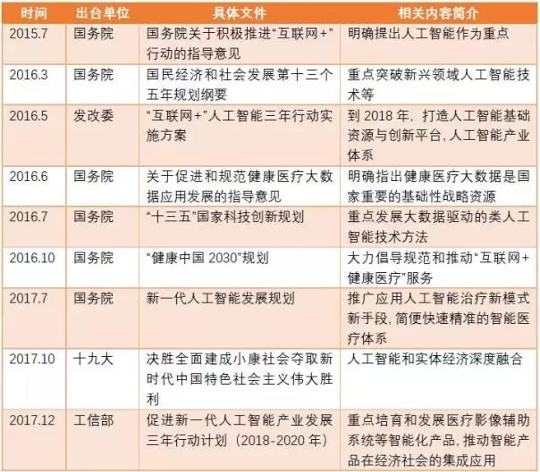 2015年起,国家陆续出台了推动医疗人工智能领域发展的一系列政策,对于人工智能在医疗领域的应用和开展起到了指导性作用。人工智能在医疗方面的应用主要分为以下几个方向:临床诊疗决策支持系统、智能医学影像识别、病理分型和多学科会诊、智能语音电子病历系统等。
