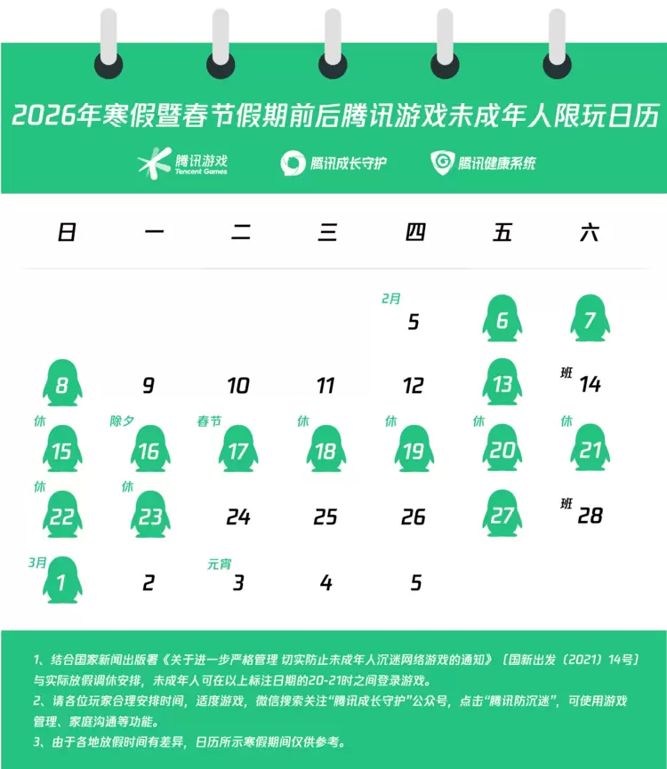 2月5日,腾讯游戏发布2026年寒假暨春节假期前后未成年人游戏限玩通知,根据相关规定,寒假29天内,未成年人可玩游戏时间共计15小时。同时,针对寒假期间未成年人用网时长增加、家庭共号场景高发等潜在问题,腾讯游戏宣布正式启动“2026年寒假未成年人保护专项行动”。