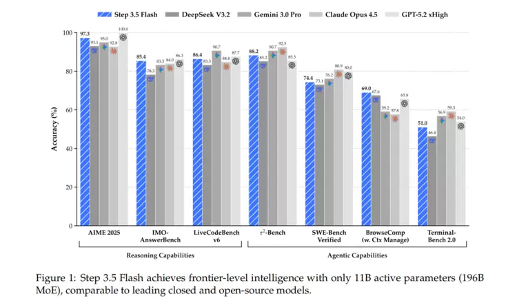 上图:Step 3.5 Flash 仅需 110 亿激活参数(1960 亿 MoE 总参数)即可实现前沿级智能,性能比肩主流闭源和开源模型。