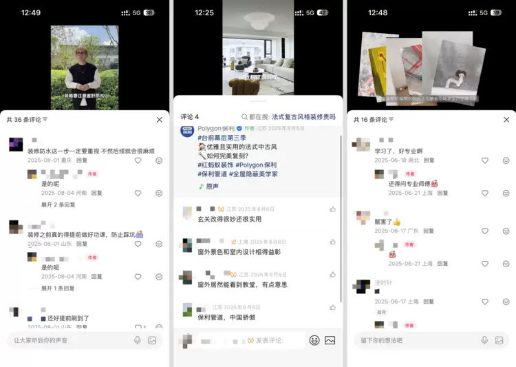 在核心选题的传播表现上,聚焦“避坑”与“实探”的内容展现了极强的穿透力。例如第十二期“装修要美要精致,到底是看设计还是施工?”的单集内容,在达人账号一举冲破56万次播放量。第3期“入住才发现装修隐患?房屋漏水如何避免?装企总裁带你避坑!”的专题播放量亦接近25万次。值得关注的是,内容的互动质量极高,全季引发了近5万次深度互动讨论。第11期关于“装修施工”的内容在Polygon保利视频号引发了逾3000次转发分享。一系列数据清晰地表明,Polygon保利已成功将晦涩的工业标准转化为大众愿意主动传播的生活常识。