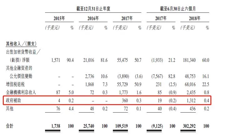 由于比特大陆在ASIC芯片研发上取得的成绩,再加上在美国制裁中兴、赛灵思收购深鉴科技等等美对中高科技领域施压的大背景之下,中国政府对于这家芯片公司的支持从过去的默许变成现在的“公开支持”,这是比特大陆推进其AI芯片发展战略的最重要前提。我们从比特大陆的招股书中也能稍看出端倪,2018上半年比特大陆获得131.2万美元的政府补助,较2017年增长约2.64倍。