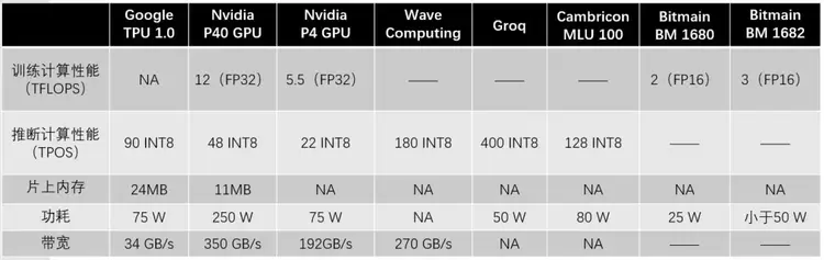 主要云端推断芯片对比
