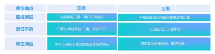 当你使用全球 CDN、DNS 或云代理服务时,你的业务健康度已经部分掌握在别人手里。当第三方网络层出问题时,客户最典型的三大困境是:监控断层(内部系统正常,用户访问超时)、责任不清(厂商说“网络可达”,用户却打不开)、响应滞后(等官方公告才确认)。