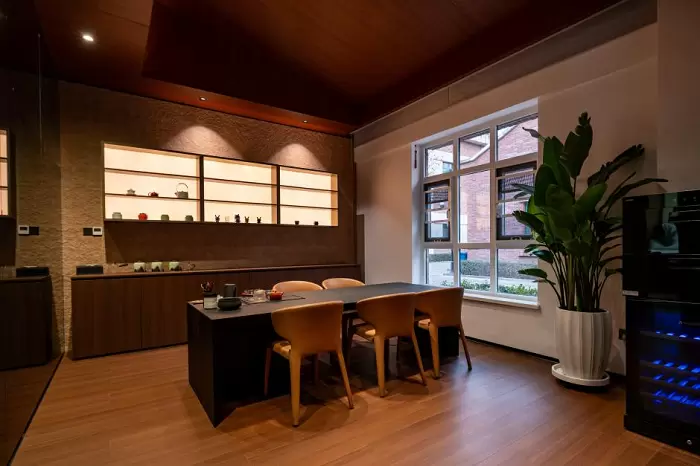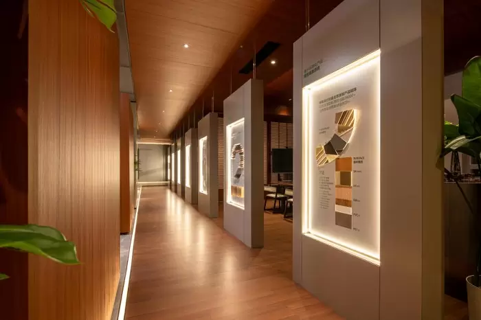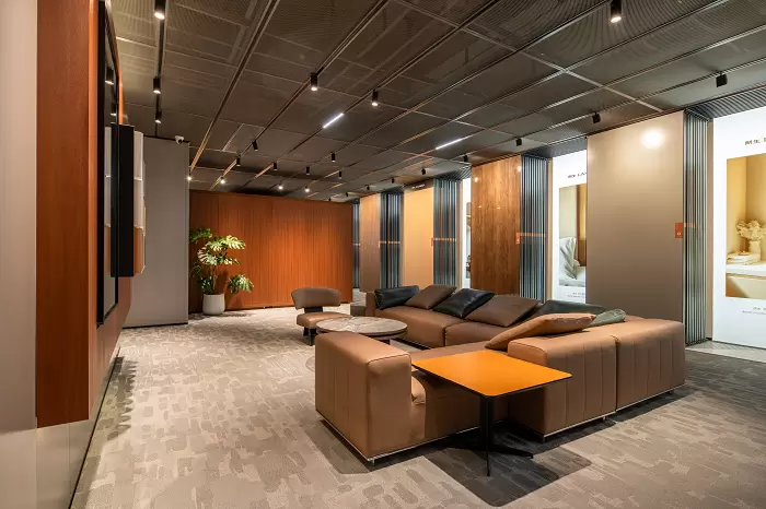 升级后的7.0中心以现代简约风格为基调,整合了材料展示、商务洽谈、会议交流等多元功能区:整齐陈列的饰面样本架覆盖丰富产品体系,便于客户直观选品;多元洽谈区与茶歇空间营造出舒适的沟通氛围;专业会议区域则适配不同规模的协作需求,整体空间既展现了朗生在整装美学上的能力,也强化了服务场景的实用性。