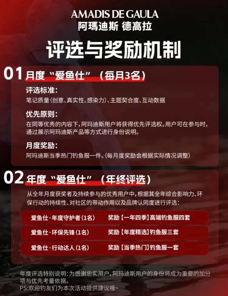 活动中,品牌每月将评选出3名优秀参与者成为月度“爱鱼仕”,并奖励阿玛迪斯当季热门钓鱼服一件;年终将从月度获奖者及持续参与者中,评选出“爱鱼仕·年度守护者”“爱鱼仕·环保先锋”“爱鱼仕·行动达人”三大奖项,最高可获得“一年四季”高端钓鱼服四套。