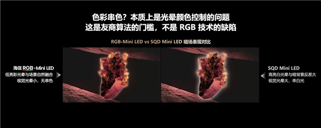 而被视为QD-Mini LED升级版的SQD-Mini LED,则沿用了单色背光+量子点的传统方案,依赖蓝光激发量子点实现“被动增色”的高色域,在转换过程中易产生色偏、色彩衰减等问题,且无法独立控色,暗场画质易出现“串白光”现象,高亮场景中又会出现色彩冲淡、偏色等,无法同时兼顾画面的纯净度与立体层次感。因此与RGB-Mini LED相比,SQD-Mini LED的整体画质表现并不理想。