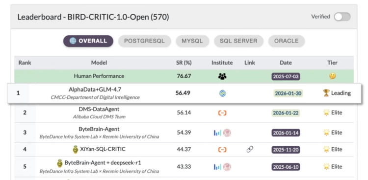 近日,中国移动数据分析类智能体“九天AlphaData”,在全球权威的SQL评测基准BIRD-CRITIC中成绩卓越,跃升榜单第一名,标志着中国移动在复杂数据分析场景下的核心能力达到国际领先水平。
