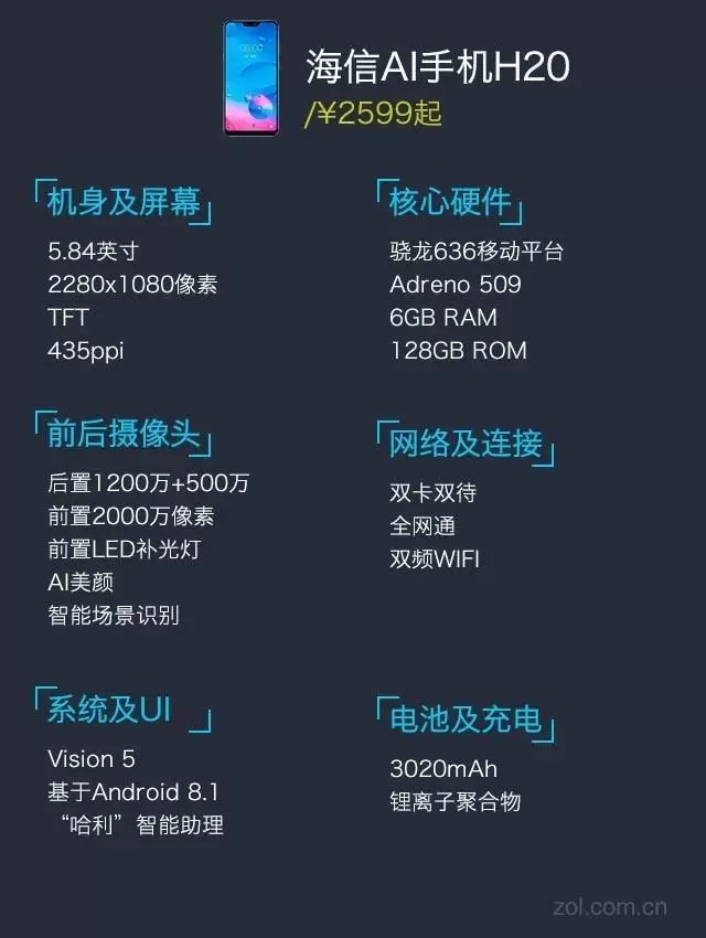 海信AI手机H20配备了一块5.84英寸刘海屏,分辨率为2280x1080。此外,三边窄边框设计让其屏占比达到了87.9%,带来更加震撼的视觉感受的同时,也让其得以在传统5.2英寸机身中塞入一块5.84英寸的全面屏,兼具视觉与实用性。