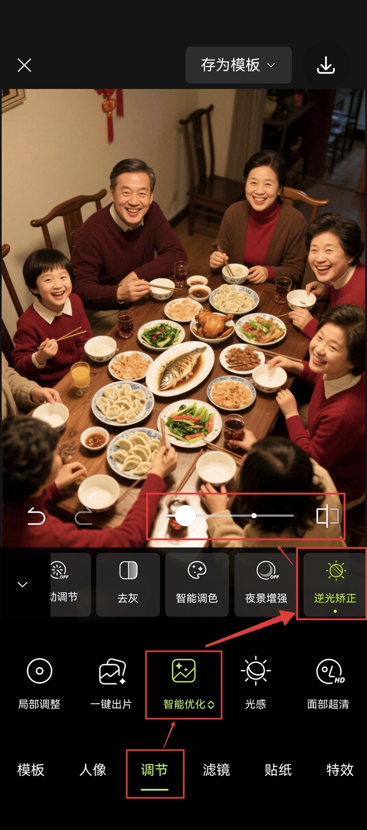 •逆光矫正,黑脸照片原地“打光”:年夜饭合影全黑脸?只需导入图片,点击“调节-智能优化-逆光矫正”滑动调节光线,暗部提亮、肤色还原,灰片秒通透~