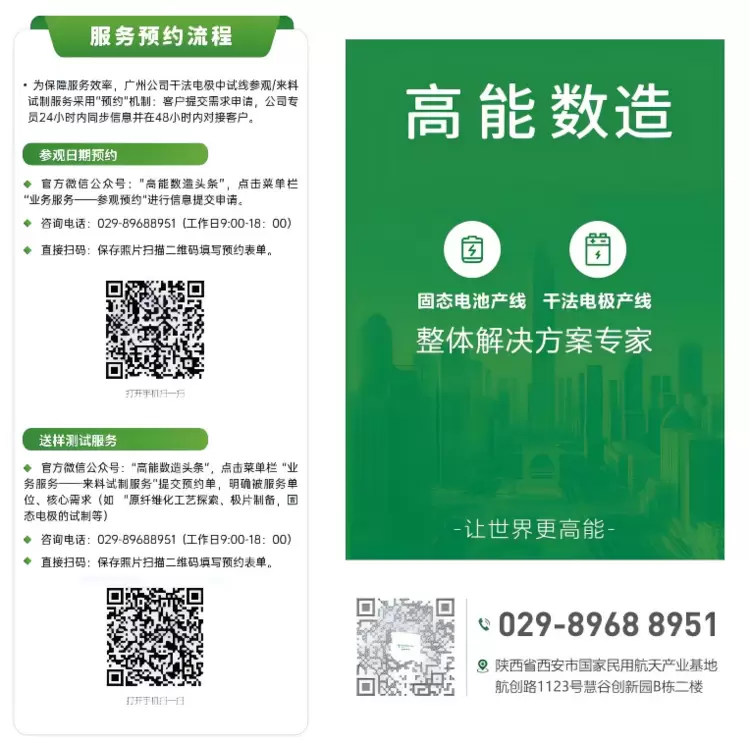 高能数造不仅提供覆盖各研发及量产阶段的干法电极核心设备,更可配套定制化产线设计、设备集成、工艺优化及全周期服务;同时可为客户提供涵盖材料体系方案、工艺参数包开发及来料试制验证在内的产业化支持,助力客户实现从技术验证到批量制造的产业化落地。