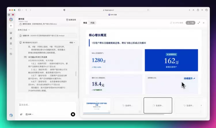 在处理表格时,它会直接生成如 SUMIFS、XLOOKUP 等原生可复核的公式;在制作演示文稿时,它能交付像素级还原、图表完全可二次编辑的底层 PPT 文件;在长文档处理中,它则能无缝继承原有的标题层级与缩进排版。通过对办公底层细节的极致掌控,WPS 灵犀让工作成果即刻可用,真正打通了办公交付的最后一公里。