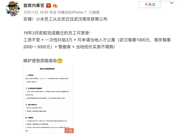网曝小米员工从北京迁往武汉南京政策:可获3万元补贴