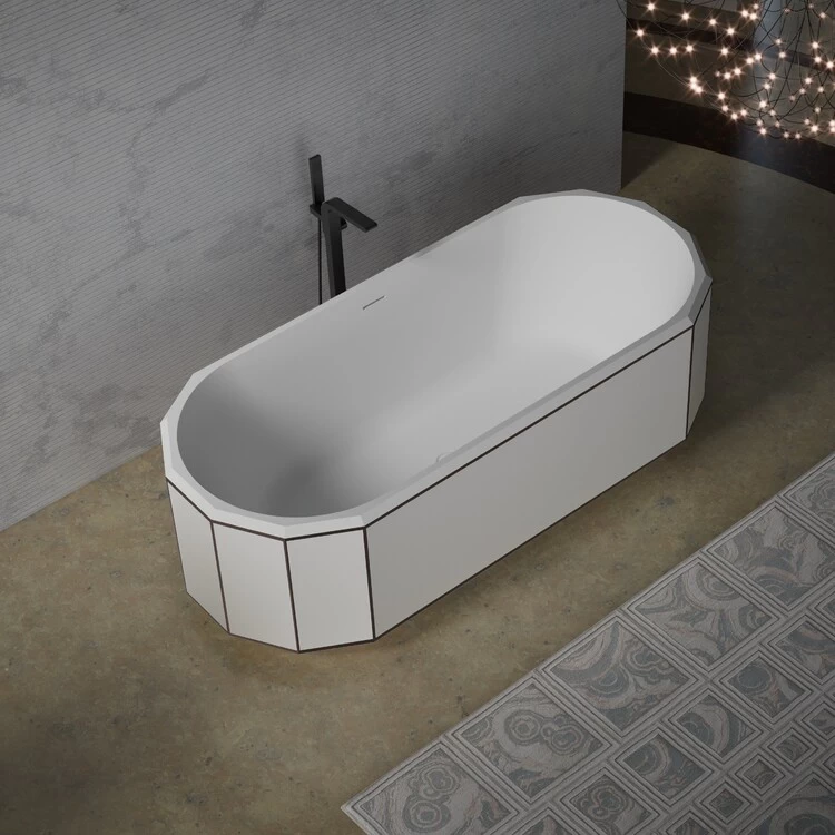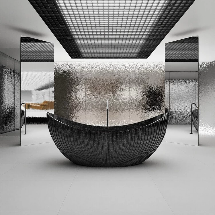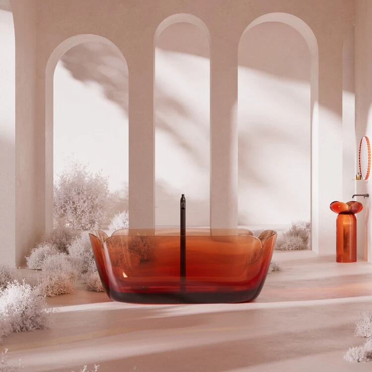 以纵向木纹围合亚克力浴缸缸体,木材的温润肌理与纯净缸体相融,静谧而克制。