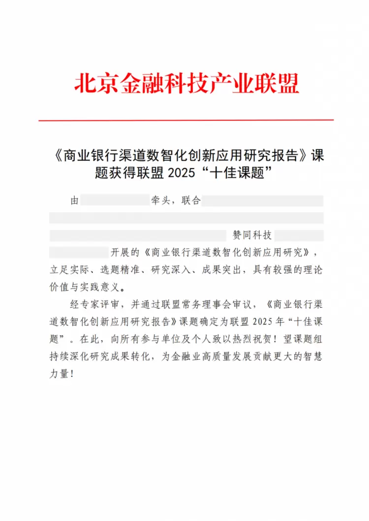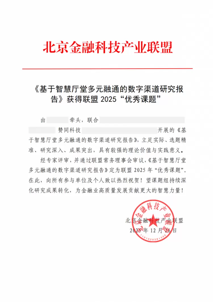 同时北京金融科技产业联盟正式公布了2025年度“十佳课题”、“优秀课题”评选结果,赞同科技参与编制的《商业银行渠道数智化创新应用研究报告》、《基于智慧厅堂多元融通的数字渠道研究报告》、《数字银行用户同意与授权技术研究》获得一项2025年联盟“十佳课题”,两项2025年联盟“优秀课题”。