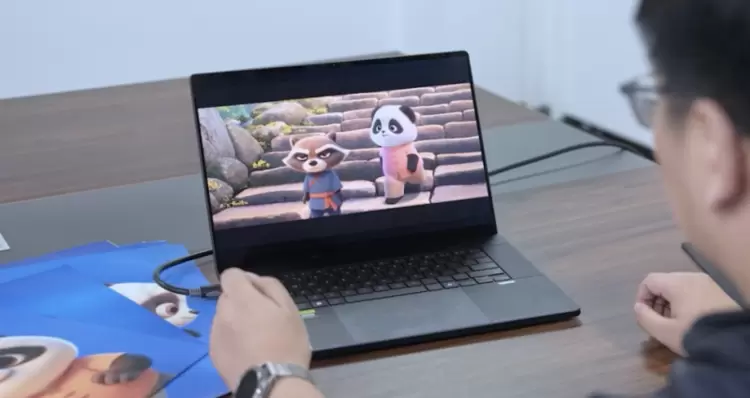 《团圆令》的角色阵容丰富,除了熊猫兄妹,还有小浣熊一火、水獭汤汤、毕婆婆、乌鸦大叔等,故事的场景也十分多元,金木水火土五族各有不同布局,这些在传统手绘模式下往往需耗时数年,但在华硕ProArt 创16的强大AI 算力支撑下,30秒能生成20套角色方案,4K超高清水墨场景每分钟12帧自动渲染,连熊猫的毛发都能动态模拟,效率直接提升80%。