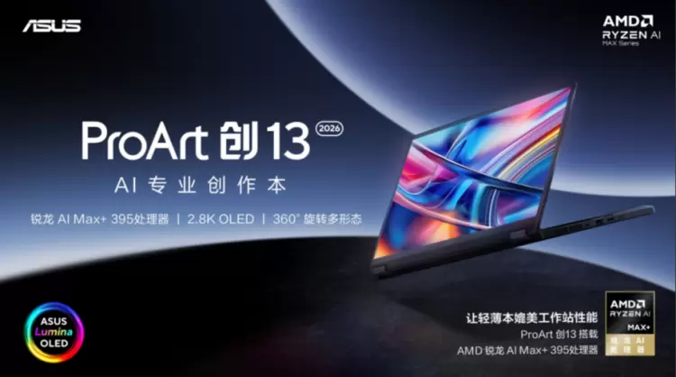 同时华硕ProArt 创13 2026也已火热开售,搭载AMD锐龙 AI Max+ 395处理器,其机身薄至15.8mm、轻约1.39kg,并支持360°旋转,可在笔记本、平板、帐篷和站立模式间自由切换,适应更多移动创作场景。