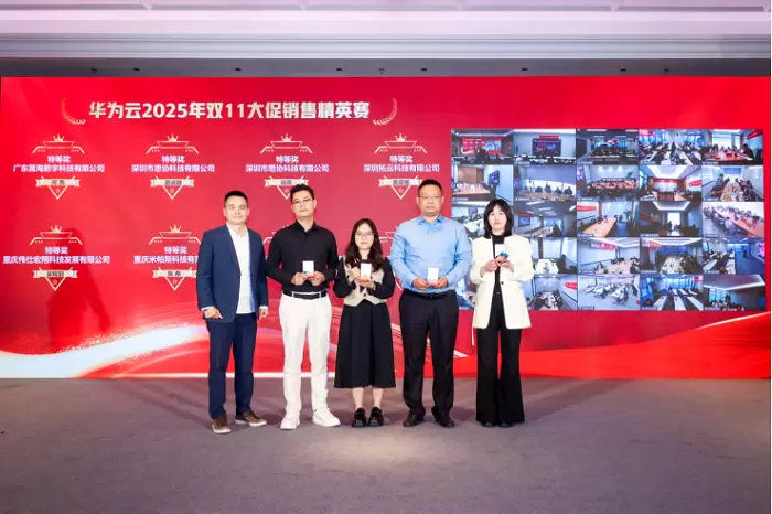 现场依次颁发了华为云2025年双11大促付费规模赛获奖伙伴、华为云2025年双11大促四大挑战赛、云穹侠胄榜及聚贤庄之战的获奖伙伴、华为云2025年双十一大促销售精英赛特等奖等奖项,以此表彰先进、树立标杆,激励全国伙伴抢抓机遇、奋勇争先。华为云SMB解决方案与持续运营部部长、华为云深圳业务部副部长为获奖代表颁奖。