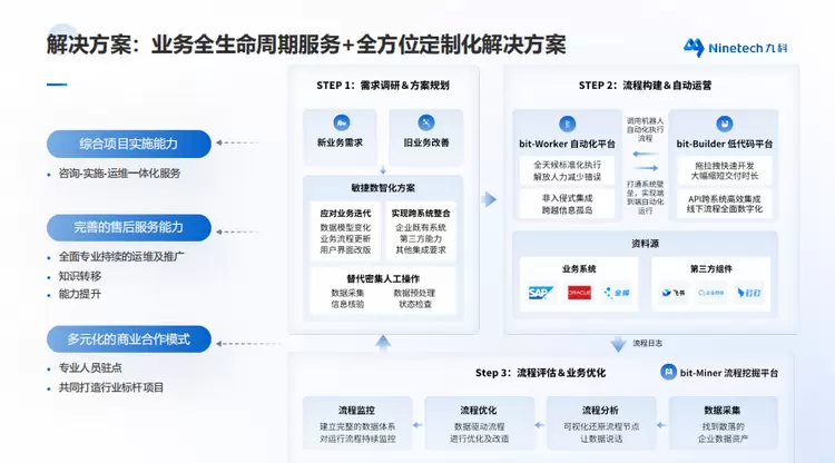 不同于通用型AI产品,九科信息的企业级Agent系统以业务场景为核心导向,深度对接企业各类业务流程,打破传统系统孤岛壁垒,实现流程自治、智能决策与跨系统协同的一体化落地。平台无需大量人工干预,可自主理解企业业务需求、拆解任务目标、调用相关系统资源,完成端到端的业务闭环,同时能够根据业务变化动态调整执行方案,提升流程运行效率,减少人为操作误差。通过标准化协议对接企业现有ERP、CRM、OA等各类系统,实现数据互通与流程联动,让企业各部门、各环节的协同更加顺畅,推动运营模式从“被动执行”向“主动决策”转型。