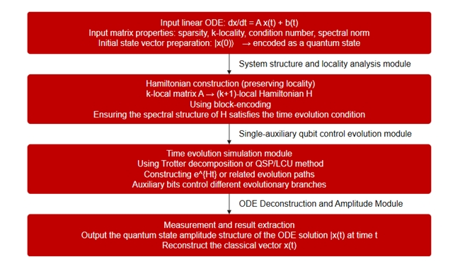 其中A为常系数矩阵,Ax(t)为目标求解向量,b(t)为可能存在的时间项。该类方程的性质决定,若矩阵A具有良好的稀疏性、局域性或可有效哈密顿化,那么量子算法便可通过线性化与演化方式构建高效求解路径。微算法科技基于此重新设计了 ODE 的量子求解流程,将其转化为哈密顿量时间演化的过程,而不是传统 HHL 那样的量子线性系统求解。这样的重新建模让算法天然具备了可局域化与可物理实现的结构优势。