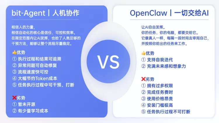 第三,使用成本上,不少人认为开源的OpenClaw可免费部署,比需要购买的bit-Agent更实惠,但实际使用中,OpenClaw的隐性成本居高不下。模型厂商对其推崇的背后,是它执行任务时会消耗大量token,且诸多token因模型规划的冗余被白白浪费,长期使用下来,token的消耗成本不容小觑;bit-Agent则通过能力固化,将同类任务的成功执行经验进行沉淀,后续执行时可直接复用,从根本上减少token消耗,还能有效规避大模型的幻觉问题,在降低使用成本的同时,进一步提升了产品的稳定性与安全性。