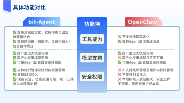 第四,灵活性上,OpenClaw虽有一定优势,但这一优势更多体现在个人轻量使用场景中,面对企业复杂的办公场景,其灵活性反而会变成“不受控”的弊端。bit-Agent并非缺乏灵活性,而是为了适配企业对安全、稳定的核心需求,在可控范围内做了合理取舍,其所有功能场景均针对企业办公设计,覆盖邮件处理、文档生成、跨渠道消息发送、表单填写等多种企业高频需求,且部署后即可实现“开箱即用”,无需企业额外投入大量精力调试,这一点是面向个人的OpenClaw无法比拟的。
