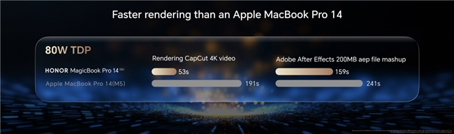 荣耀MagicBook Pro 14 2026搭载全新一代HONOR Turbo X技术,可智能识别办公、游戏、视频等日常使用场景,优化能效调度策略、动态分配系统资源、调节设备功耗,带来最高80W性能释放。实测数据显示,荣耀MagicBook Pro 14 2026的4K视频渲染导出速度优于苹果MacBook Pro 14,还可流畅运行《赛博朋克2077》《黑神话:悟空》《极限竞速:地平线5》等主流3A游戏大作,带来3A游戏绝佳体验。